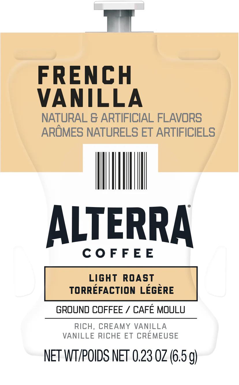 Alterra® French Vanilla Coffee is an Arabica light roast blend with rich, creamy vanilla aromatic notes. Made for your Flavia® Brewer, this Freshpack produces drip coffee and contains natural and artificial flavors.