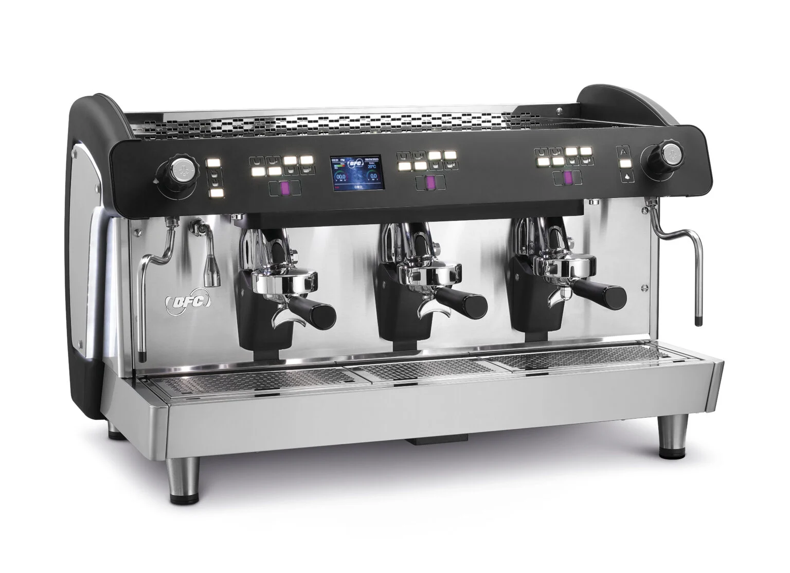 Designed for high-volume, professional brewing, the BFC Antelao brings café-grade espresso to offices, workplace cafés, and hospitality. A TFT touch display lets staff set and monitor parameters per coffee; insulated copper boilers and heat-balancing groups deliver steady temperatures; and anti-scald steam nozzles keep service safe and smooth. Side and sub-group lighting brighten the workspace, while ECO mode cuts power draw during lulls.