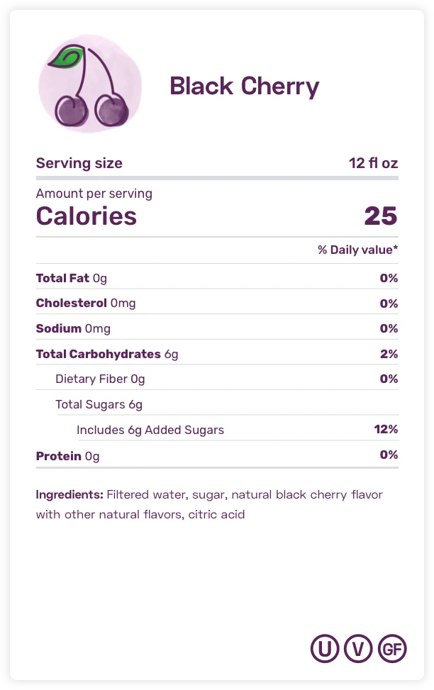 Ingredients: Filtered water, natural black cherry flavor, sugar, citric acid, potassium sorbate